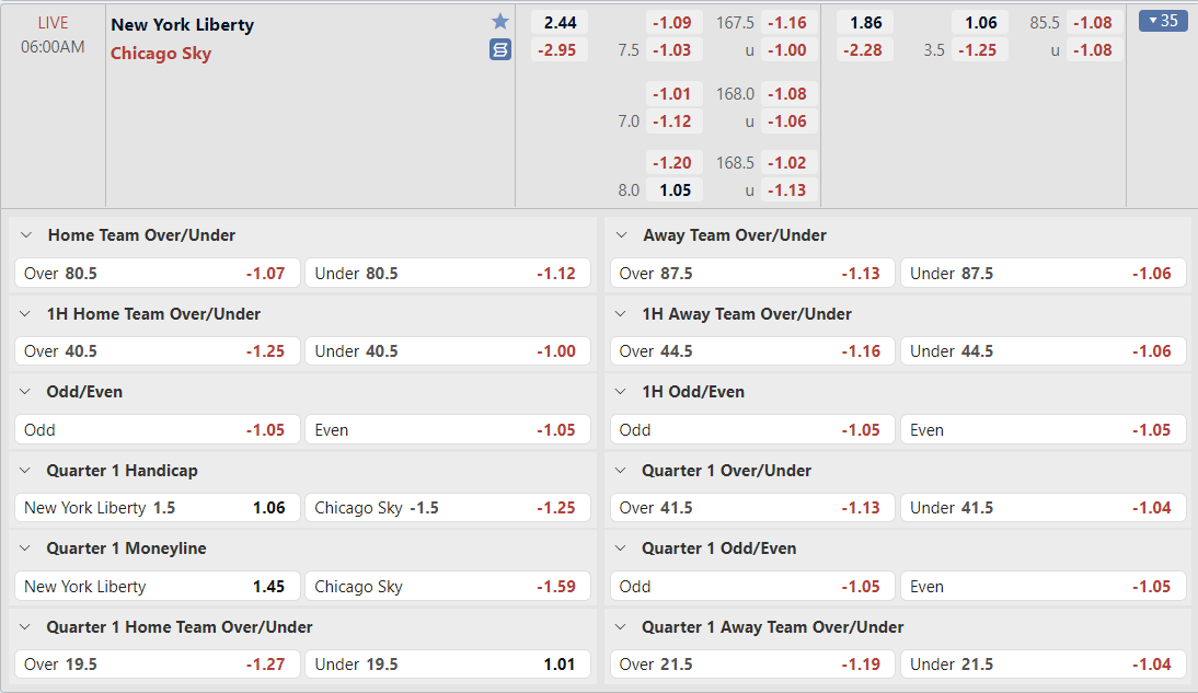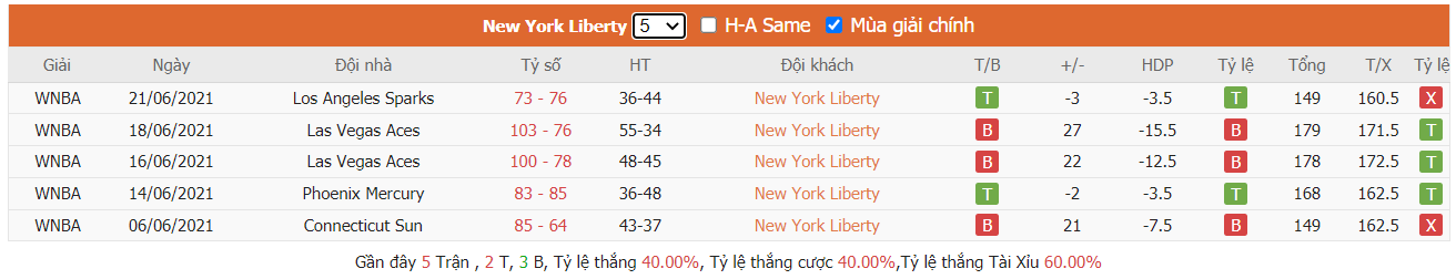 Bảng tỷ lệ kèo New York Liberty vs Chicago Sky
