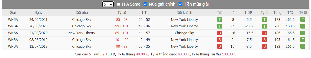 Thành tích đối đầu New York Liberty vs Chicago Sky