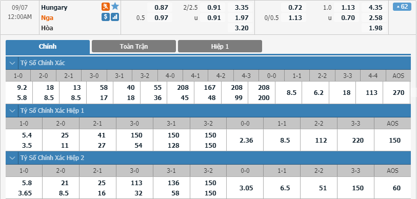 - Tỷ lệ kèo bóng đá Hungary vs Nga