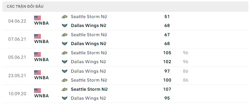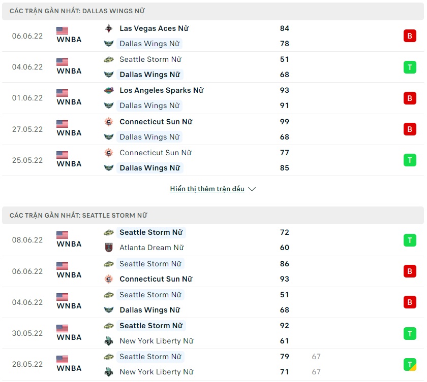 Phong độ gần đây Dallas Wings vs Seattle Storm