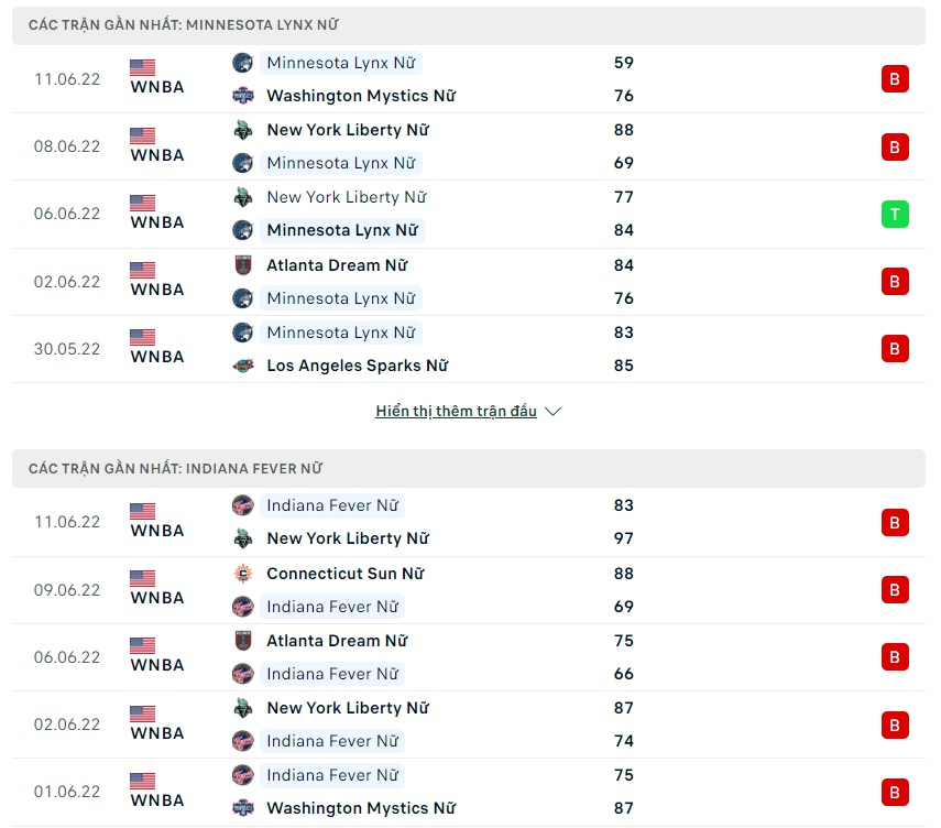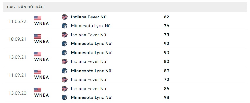 Phong độ gần đây Minnesota Lynx vs Indiana Fever