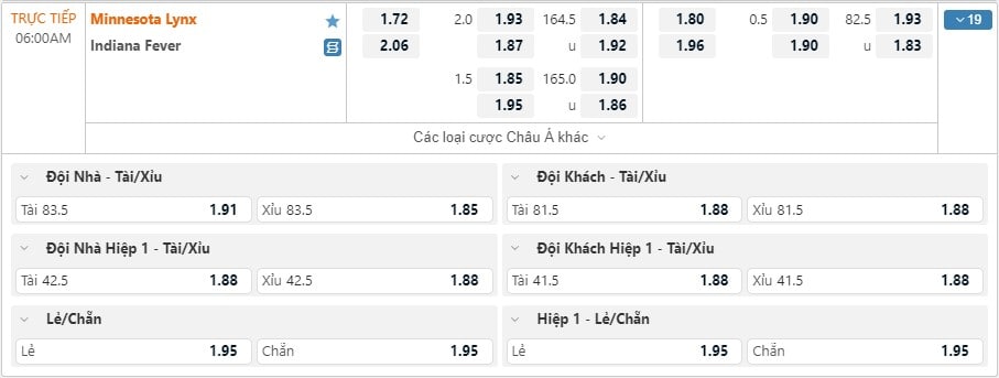 Bảng kèo Minnesota Lynx vs Indiana Fever