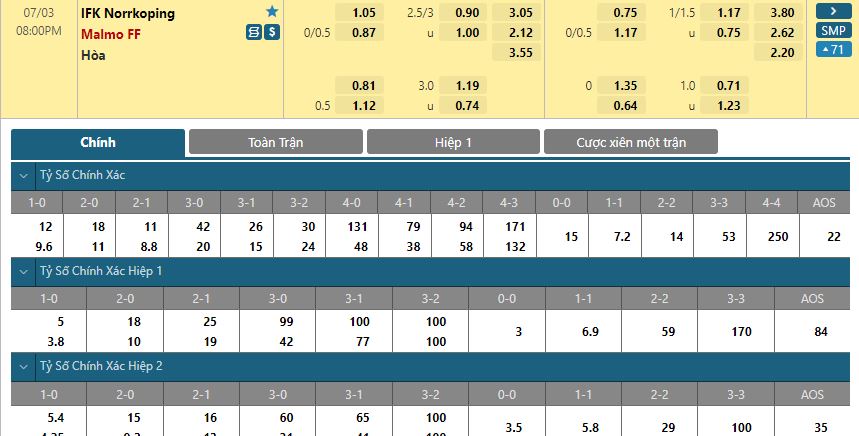 Bảng tỷ lệ kèo trực tuyến trận đấu Norrkoping vs Malmo: