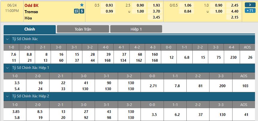 Bảng tỷ lệ kèo trực tuyến trận đấu ODD Ballklubb vs Tromso: