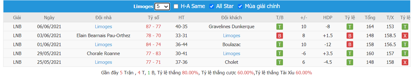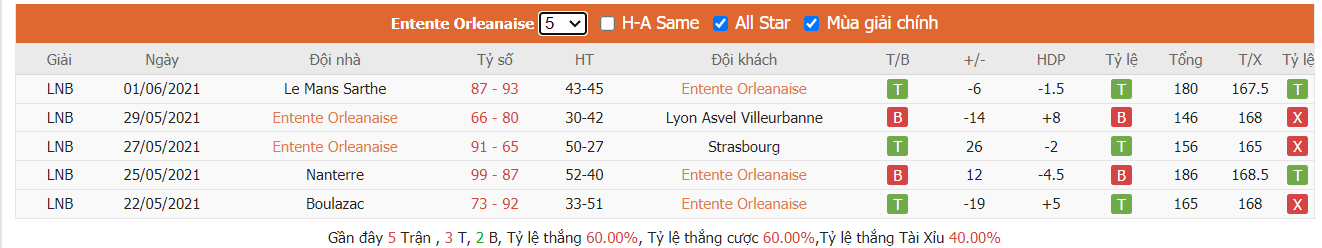 Thống kê cũng chỉ ra Limoges CSP vẫn đang duy trì được sự đồng điều trong cả nhiệm vụ tấn công và phong thủ, cụ thể đội khách chỉ ghi được trung bình 85 điểm mỗi trận trong 2 trận sân khách gần nhất cũng như chỉ để mất trung bình 87 điểm mỗi trận trong thời gian trên. Trong khi đó không được đánh giá cao ở trận đấu này, nhiệm vụ chính của Orléans Loiret Basket chắc hẳn sẽ là tập trung căng sức để bảo vệ rổ nhà. Ngoài ra chính điều này cũng sẽ làm giảm đi sự hiệu quả của các tình huống áp sát và lên rổ từ phía Limoges CSP. Như vậy cửa xỉu vẫn là sự lựa chọn sáng hơn cho giới đầu tư ở trận này, nhất là khi mà đã có tới 6 trên 7 trận gần nhất của Limoges CSP, 7 trên 9 trận gần nhất của Orléans Loiret Basket và cả 4 trên 6 trận so tài gần nhất của hai bên cũng đã ghi nhận kết quả chung cuộc về xỉu.