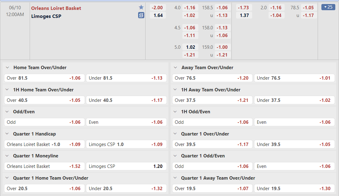 Bảng tỷ lệ kèo Orléans Loiret Basket vs Limoges CSP