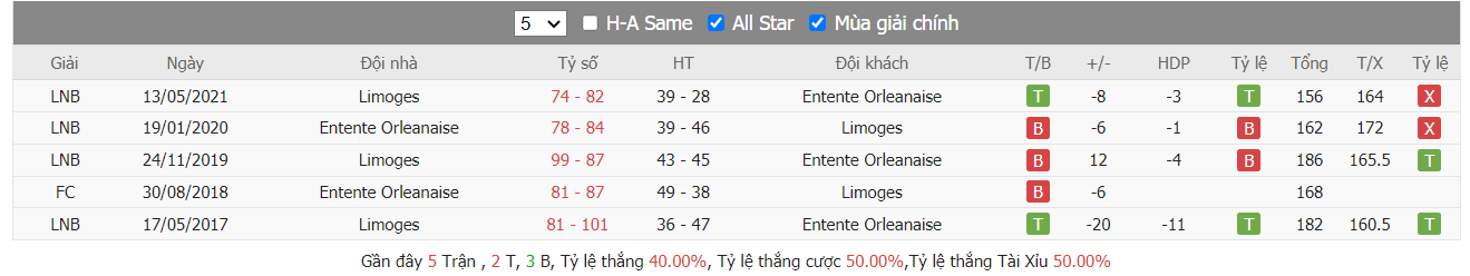 Thống kê từ 3/2019 cho đến nay, hai đội đã gặp nhau cả thảy 10 lần, trong đó cũng có 4 lần diễn ra trên sân nhà của Orléans Loiret Basket, kết quả cho thấy Limoges CSP đang là đội nắm giữ ưu thế cao hơn khi đã giành được tới 8 chiến thắng. Trong số đó ở lần gặp nhau gần nhất diễn ra hồi tháng 2 vừa qua, với lợi thế sân nhà lúc đó, Limoges CSP đã ca được khú khải hoàn sau chiến thắng 82 – 74 khi tiếp đón chính Orléans Loiret Basket. Sắm vai đội khách ở trận đấu sắp tới nhưng Limoges CSP vẫn là sự lựa chọn sáng hơn khi đã giành được tới 4 chiến thắng gần nhất về kèo theo TLCA, trong khi Orléans Loiret Basket cũng chỉ có duy nhất 1 lần mang lại được niềm vui cho giới đầu tư trong cả thảy 5 trận ra sân đã qua.