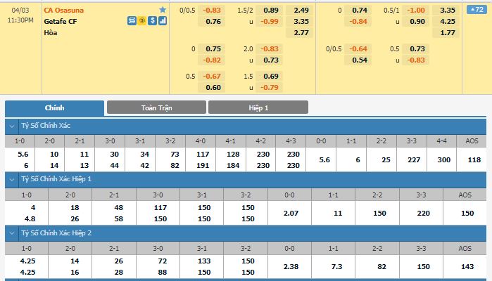 Bảng tỷ lệ kèo trực tuyến trận đấu Osasuna vs Getafe: