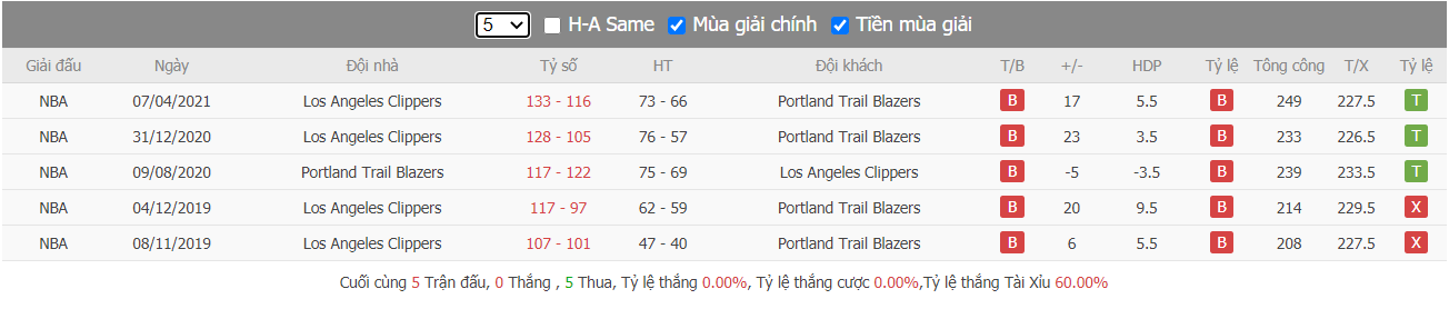 Thành tích đối đầu Portland Trail Blazers vs Los Angeles Clippers