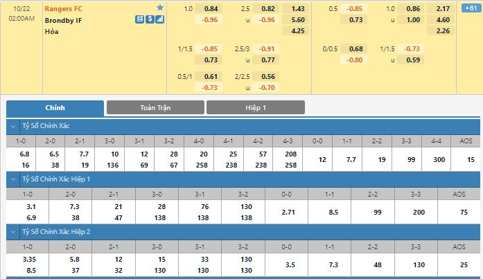 Bảng tỷ lệ kèo trực tuyến trận đấu Rangers vs Brondby: