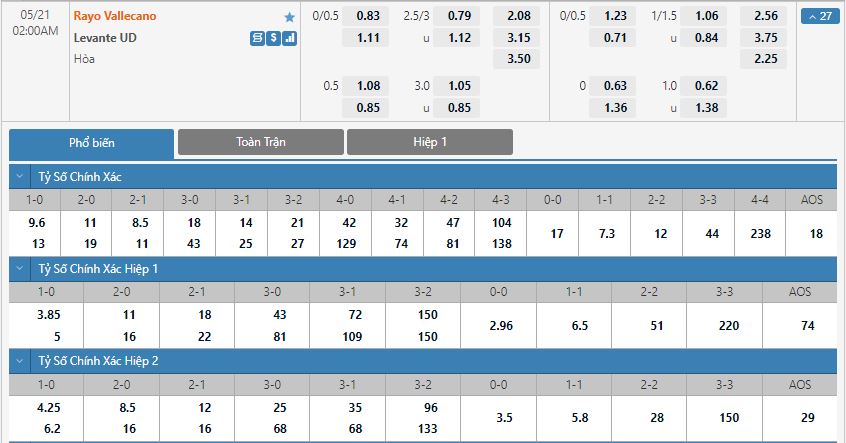 - Kèo tỉ số hiệp 1: Rayo Vallecano 1-1 Levante