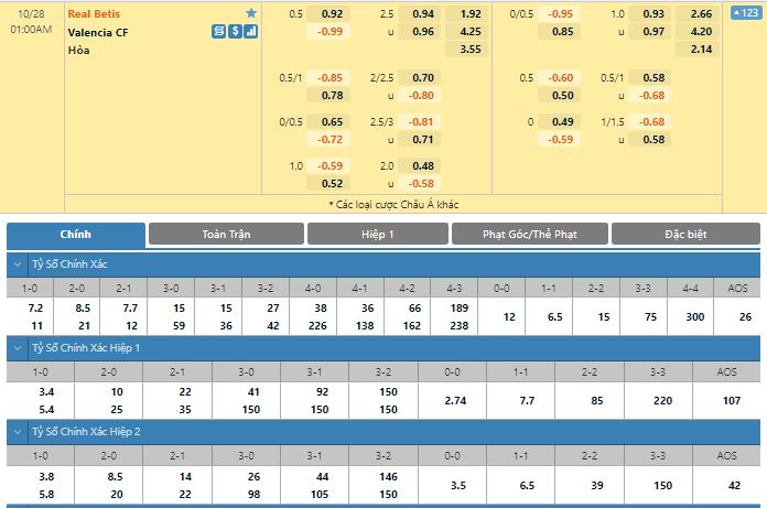 Bảng tỷ lệ kèo trực tuyến trận đấu Real Betis vs Valencia: