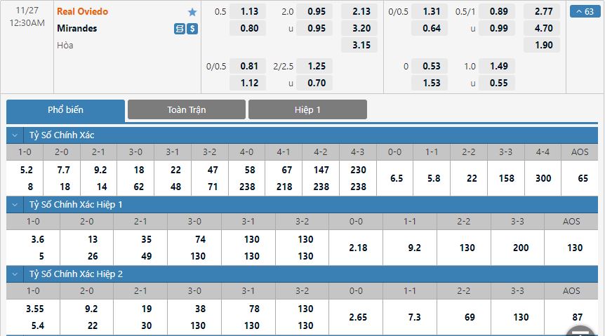 Bảng tỷ lệ kèo trực tuyến trận Real Oviedo vs CD Mirandes