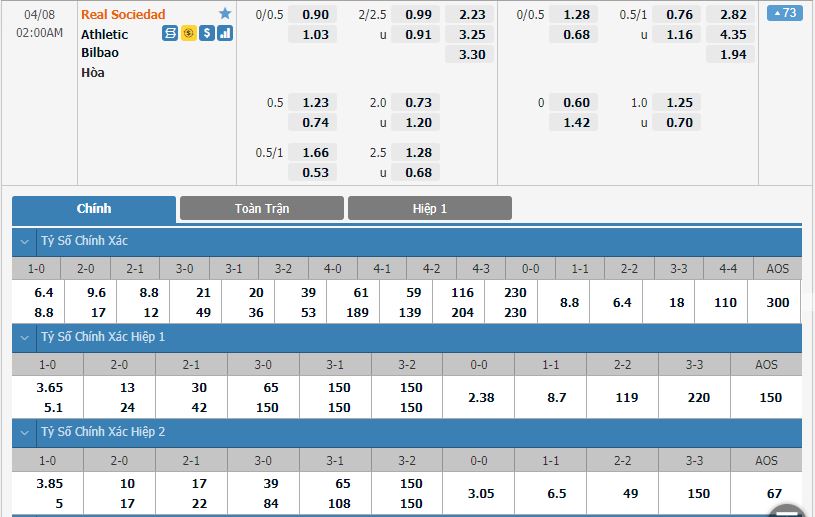 Bảng tỷ lệ kèo bóng đá Real Sociedad vs Athletic Club