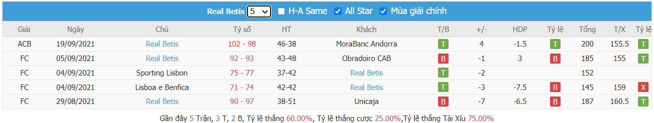 Thống kê cho thấy khả năng săn điểm của các cầu thủ cả hai đội đều không quá ấn tượng khi mà Real Betis CooSur mới chỉ ghi được 113 điểm trong trận sân nhà gần nhất, trong khi Río Breogán cũng chỉ ghi được trung bình 102 điểm mỗi trận trong 2 trận sân nhà đã qua, từ đó dẫn tới việc có tới 4 trên 5 trận gần nhất của Río Breogán chỉ kết thúc với kết quả chung cuộc về xỉu. Không những vậy mà cũng đã ghi nhận tới 5 trên 7 trận so tài gần nhất của hai bên vẫn chưa thể đạt đến mức kèo quy định theo TLCA. Vậy nên rất có thể trận đấu này sẽ diễn ra với thế trận chặt chẽ và không có nhiều bàn thắng được ghi.