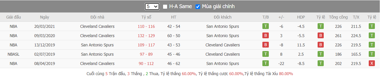 Thống về thành tích đối đầu của hai bên trong quá khứ, kết quả cho thấy còn nhớ trong lần đối đầu đã qua của hai đội diễn ra trong mùa giải năm nay, khi đó San Antonio Spurs đã phải nhận thất bại 99-121 khi hành quân đến sân của Cleveland Cavaliers. Tuy nhiên với lợi thế được ra sân ngay trên sân nhà ở trận đấu tới, San Antonio Spurs vẫn được đánh giá cao hơn cả khi đã toàn thắng trong cả 3 trận đối đầu trước đó của hai bên kể từ 03/2019 cho tới nay. Như vậy San Antonio Spurs vẫn sẽ là sự lựa chọn sáng hơn ở kèo đấu này.