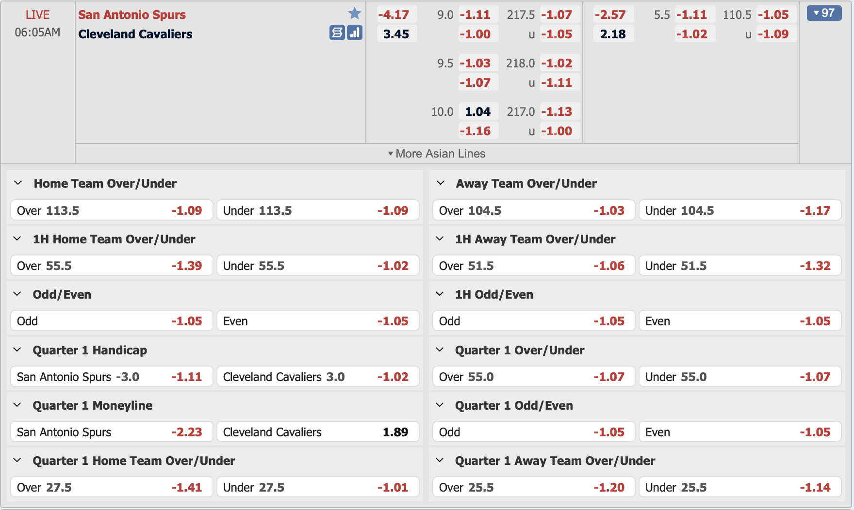 Bảng tỷ lệ kèo San Antonio Spurs vs Cleveland Cavaliers