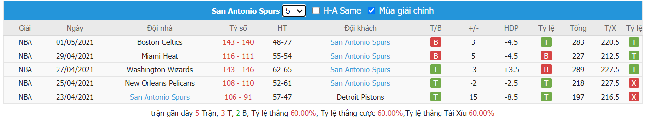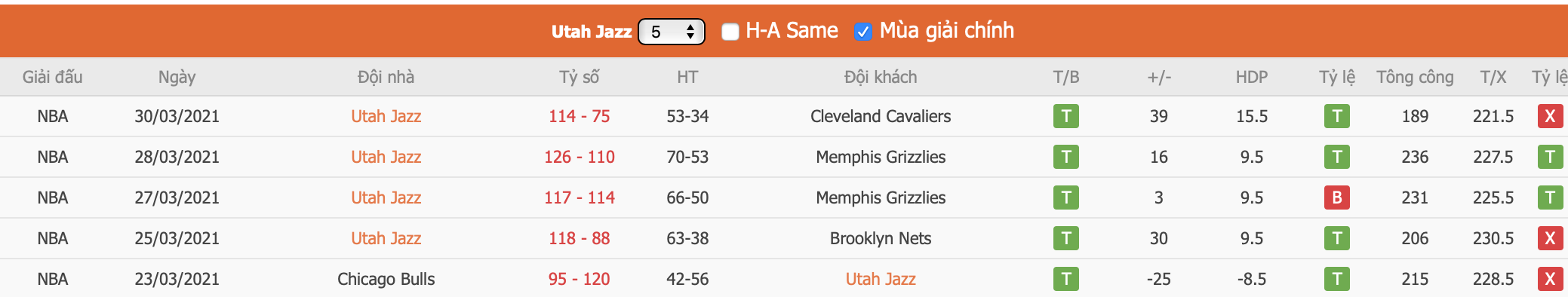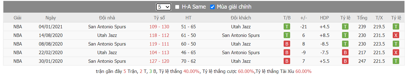 Thống kê về thành tích đối đầu của hai bên trong quá khứ, kết quả cho thấy đội chủ nhà đã toàn thắng trên 9 trận đối đầu của hai bên kể từ 01/2017 cho tới nay, trong đó có 4 trận diễn ra trên sân Vivint Smart Home Arena của Utah Jazz, trong số đó ở lần đối đấu mới đây, khi đó dù có lợi thế sân nhà nhưng San Antonio Spurs vẫn phải phơi áo sau thất bại 86 - 96 khi tiếp đón chính Utah Jazz. Vậy nên Utah Jazz hoàn toàn là sự lựa chọn sáng hơn với giới đầu tư nhất là khi đã toàn thắng về kèo theo TLCA trong 5 trận gần nhất.