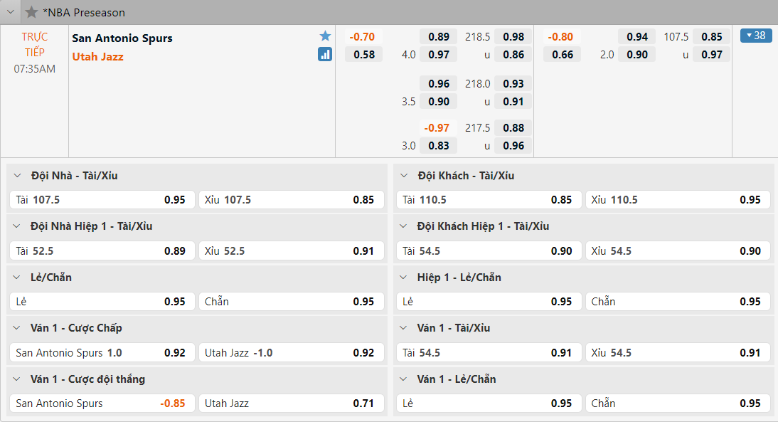 Bảng tỷ lệ kèo San Antonio Spurs vs Utah Jazz