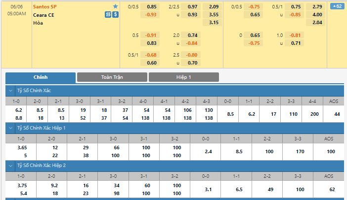 Bảng tỷ lệ kèo trực tuyến trận đấu Santos vs Ceara: