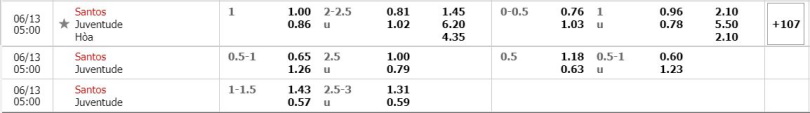 Bảng tỷ lệ kèo bóng đá Santos vs Juventude