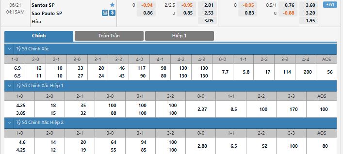 Bảng tỷ lệ kèo trực tuyến trận đấu Santos vs Sao Paulo: