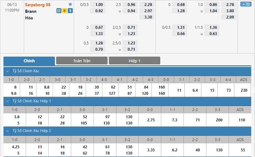 - Kèo tỉ số hiệp 1: Sarpsborg 08 FF 0-0 Brann