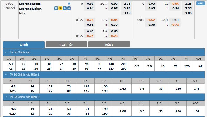 Bảng tỷ lệ kèo trực tuyến trận đấu SC Braga vs Sporting CP: