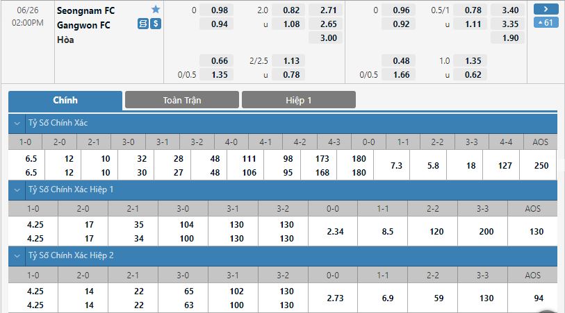 Bảng tỷ lệ kèo trực tuyến trận đấu Seongnam FC vs Gangwon FC