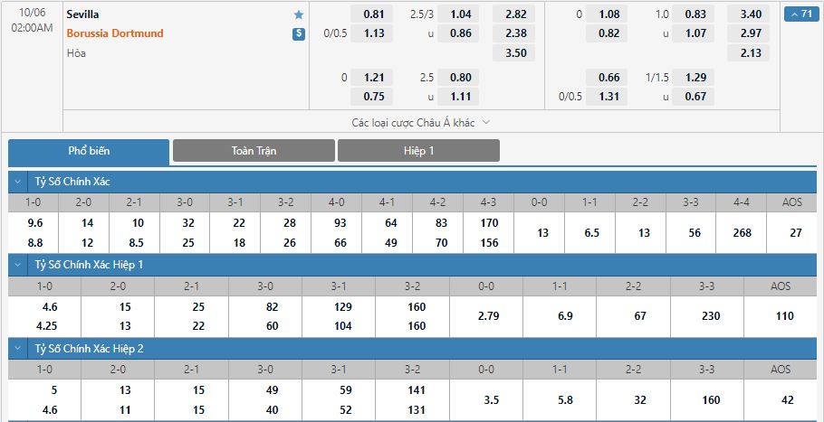 Bảng tỷ lệ kèo trực tuyến trận Sevilla vs Borussia Dortmund