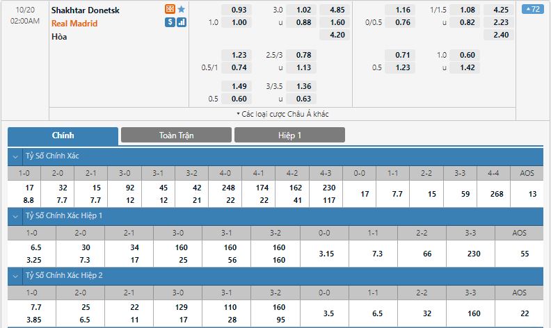 Bảng tỷ lệ kèo trực tuyến trận đấu Shakhtar Donetsk vs Real Madrid