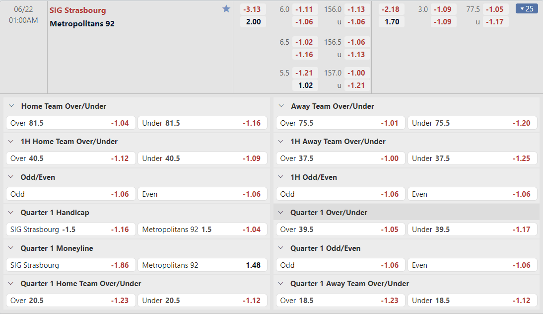 Bảng tỷ lệ kèo SIG Strasbourg vs Metropolitans 92
