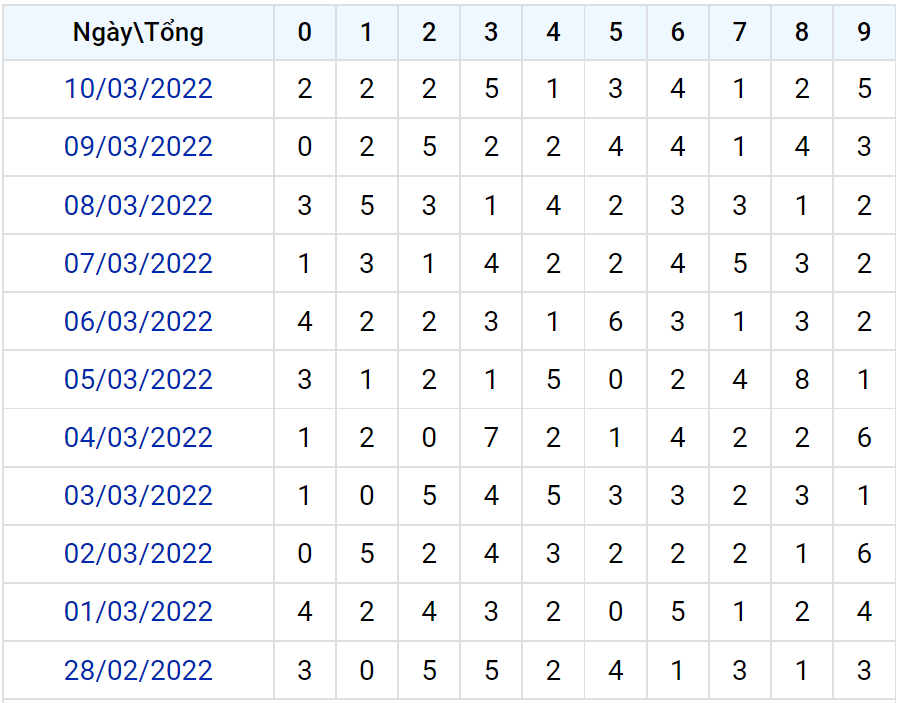 Thống kê loto XSMB theo tổng tính đến ngày 10/03/2022