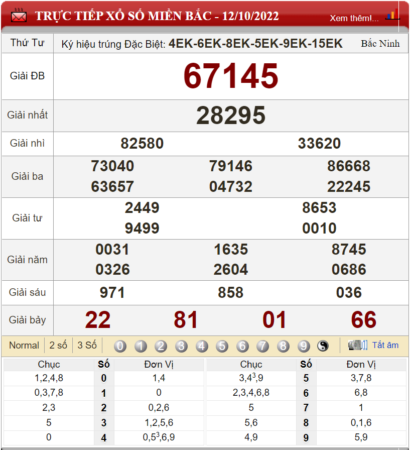 Kết quả cầu lô theo xổ số miền Bắc ngày 12/10/2022