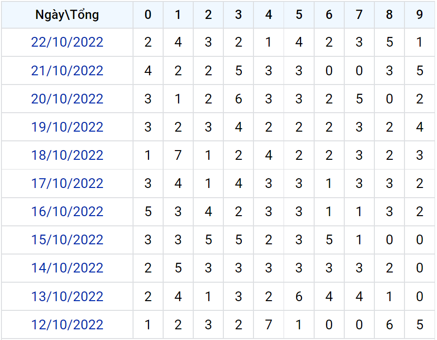 Thống kê loto XSMB theo tổng tính đến ngày 22/10/2022
