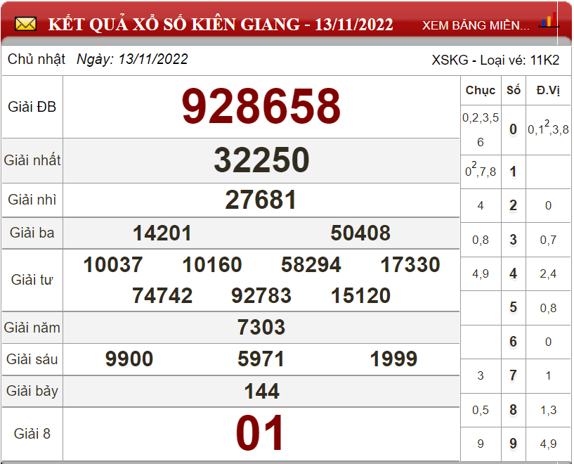 Kết quả lô đề theo xổ số Kiên Giang ngày 13/11/2022