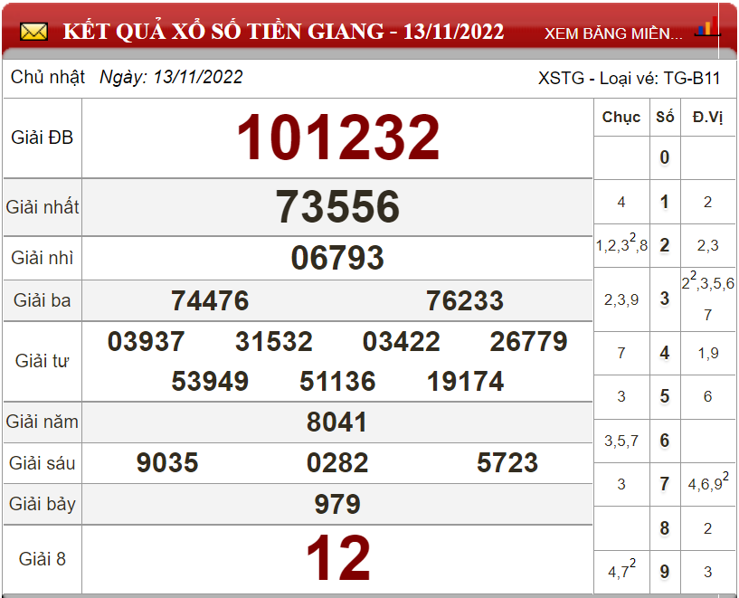 Kết quả lô đề theo xổ số Tiền Giang ngày 13/11/2022
