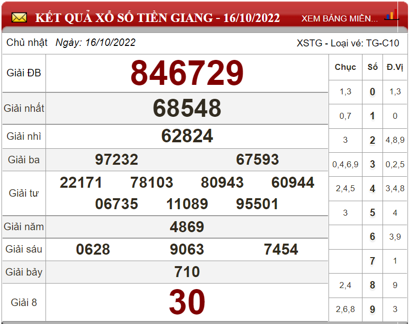 Kết quả lô đề theo xổ số Tiền Giang ngày 16/10/2022