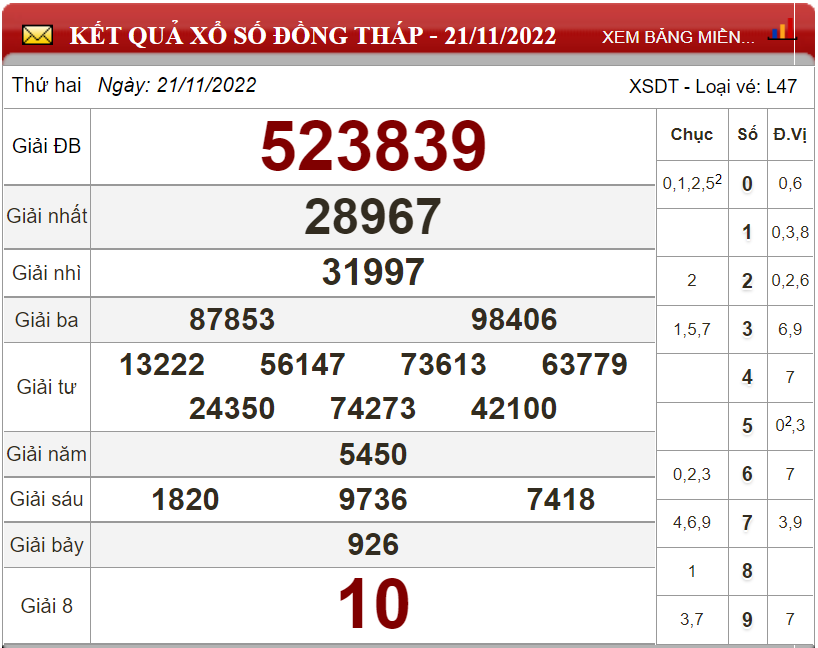 Kết quả lô đề theo xổ số Đồng Tháp ngày 21/11/2022