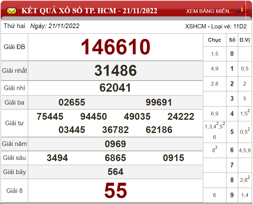 Kết quả lô đề theo xổ số TP.HCM ngày 21/11/2022