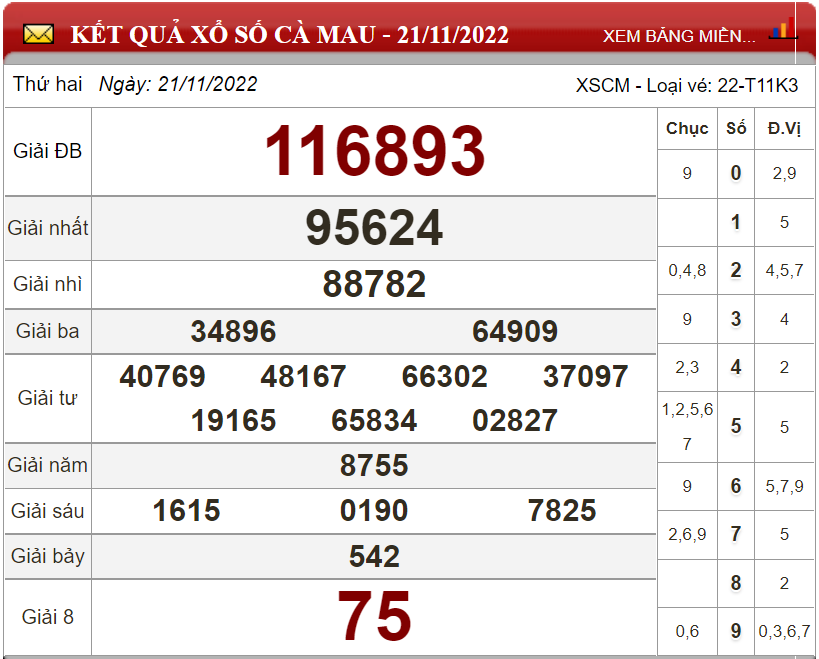 Kết quả lô đề theo xổ số Cà Mau ngày 21/11/2022
