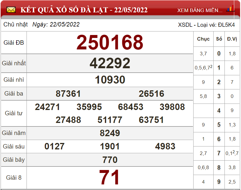 Kết quả lô đề theo xổ số Đà Lạt ngày 22/5/2022