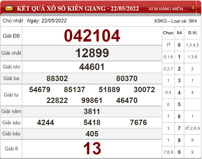 Kết quả lô đề theo xổ số Kiên Giang ngày 22/5/2022