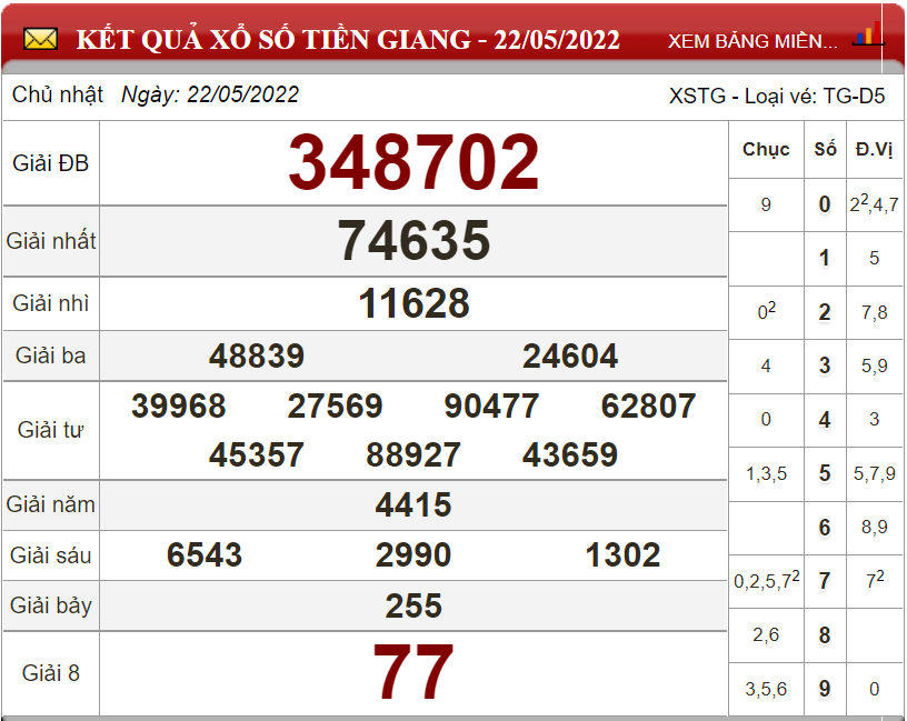 Kết quả lô đề theo xổ số Tiền Giang ngày 22/5/2022