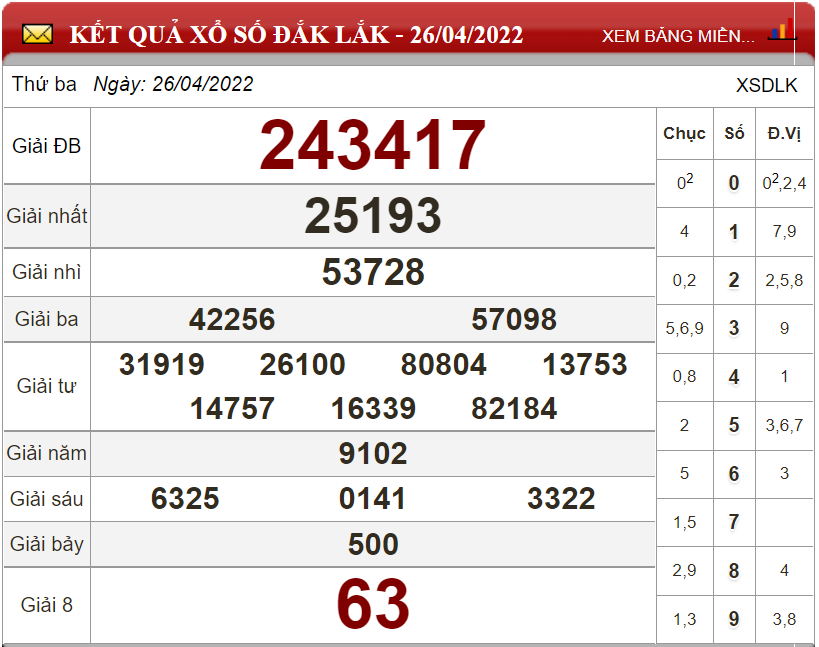 Kết quả lô đề theo xổ số Đắk Lắk ngày 26/4/2022