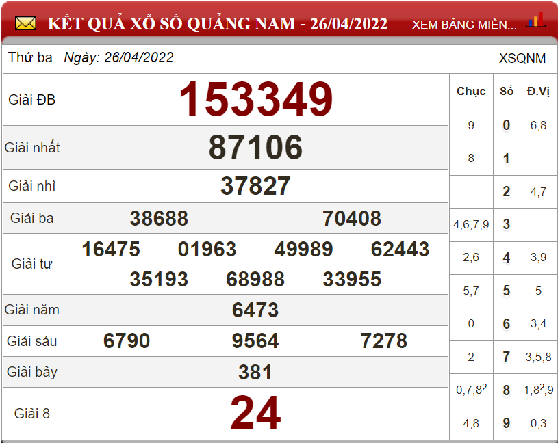 Kết quả lô đề theo xổ số Quảng Nam ngày 26/4/2022