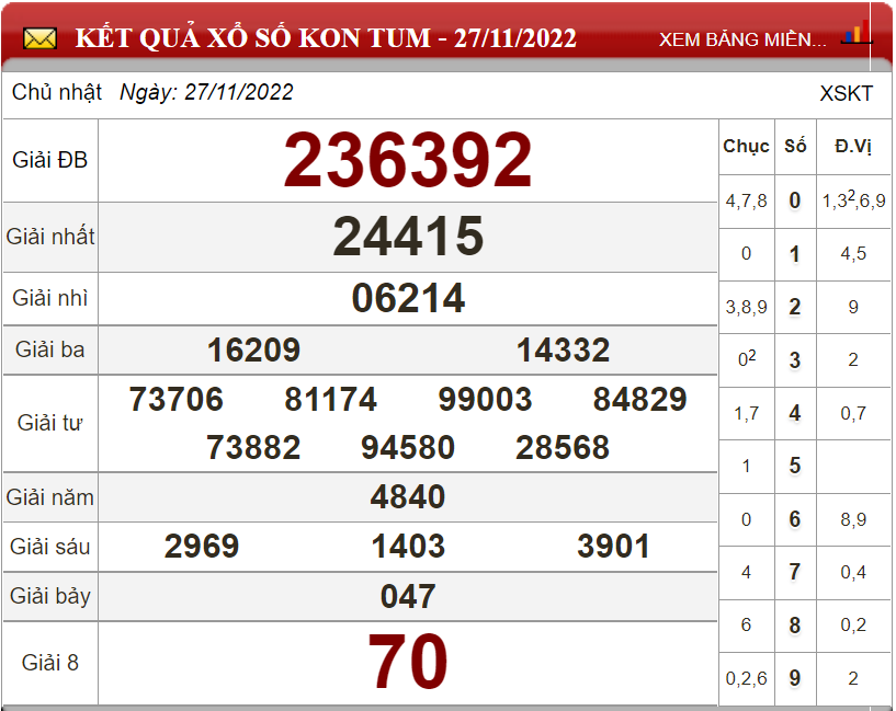 Kết quả lô đề theo xổ số Kon Tum ngày 27/11/2022