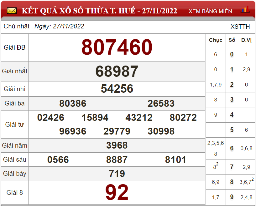Kết quả lô đề theo xổ số Thừa T.Huế ngày 27/11/2022
