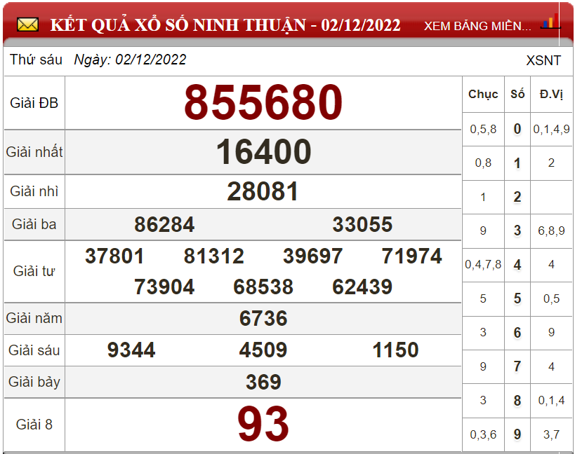 Kết quả lô đề theo xổ số Ninh Thuận ngày 02/12/2022