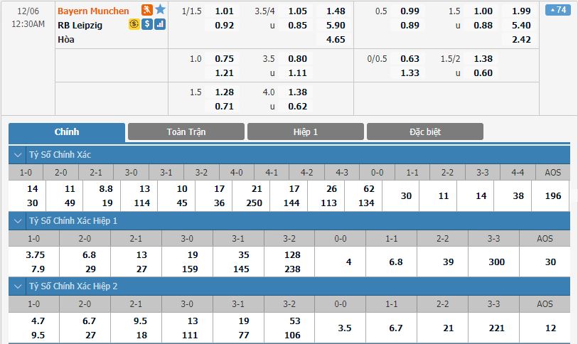 - Kèo tỉ số hiệp 1: Bayern Munich 1-0 RB Leipzig